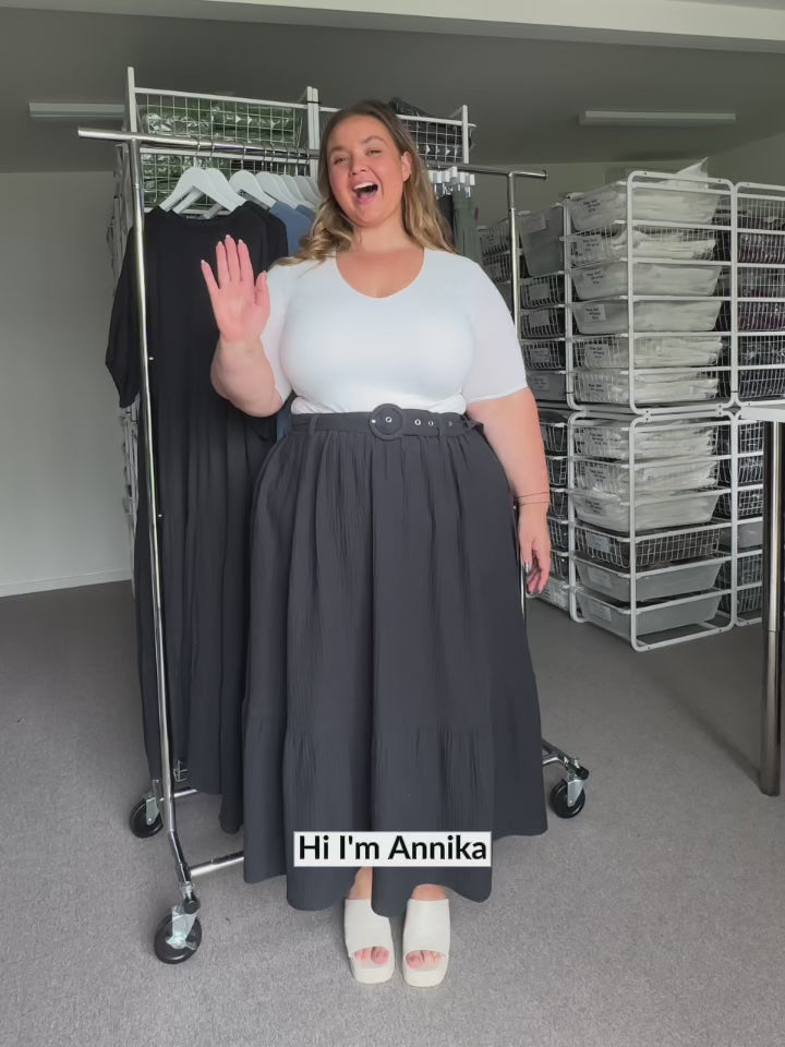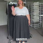 Annika wears a size 14/16 in the Indiana Skirt.