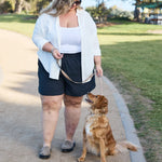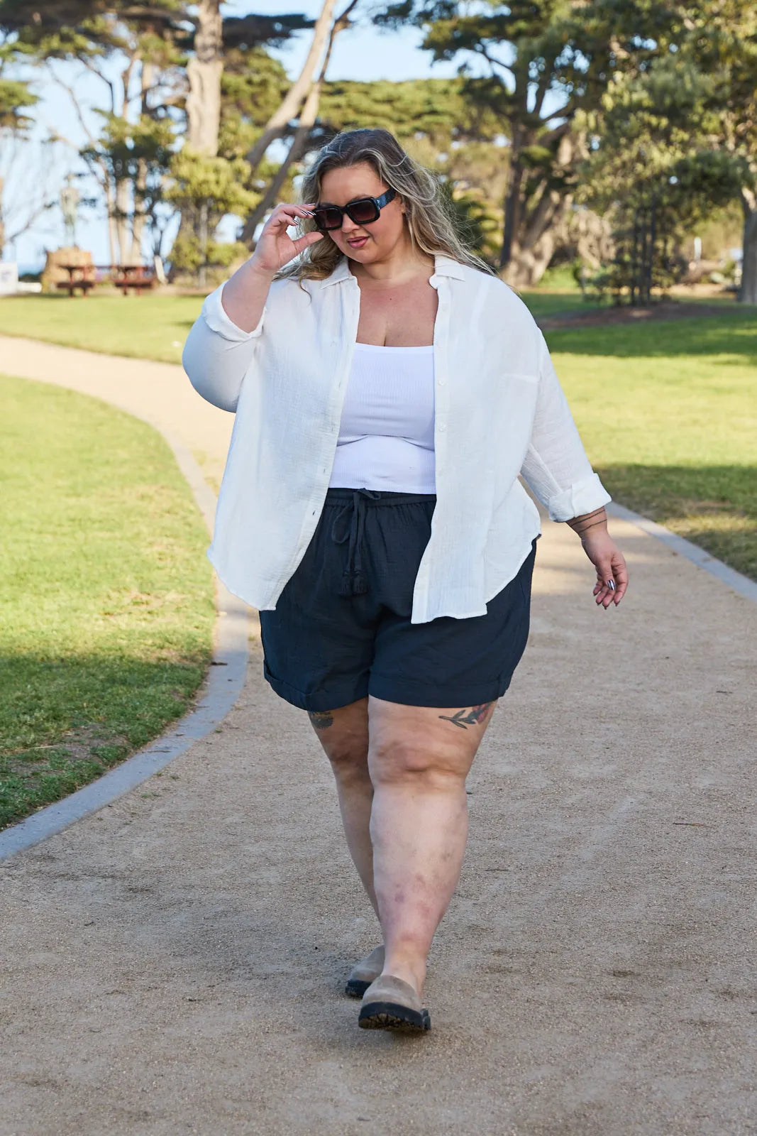 Annika wears a size 16/18 in the Reese Shirt and a 14/16 in the Romy Shorts.