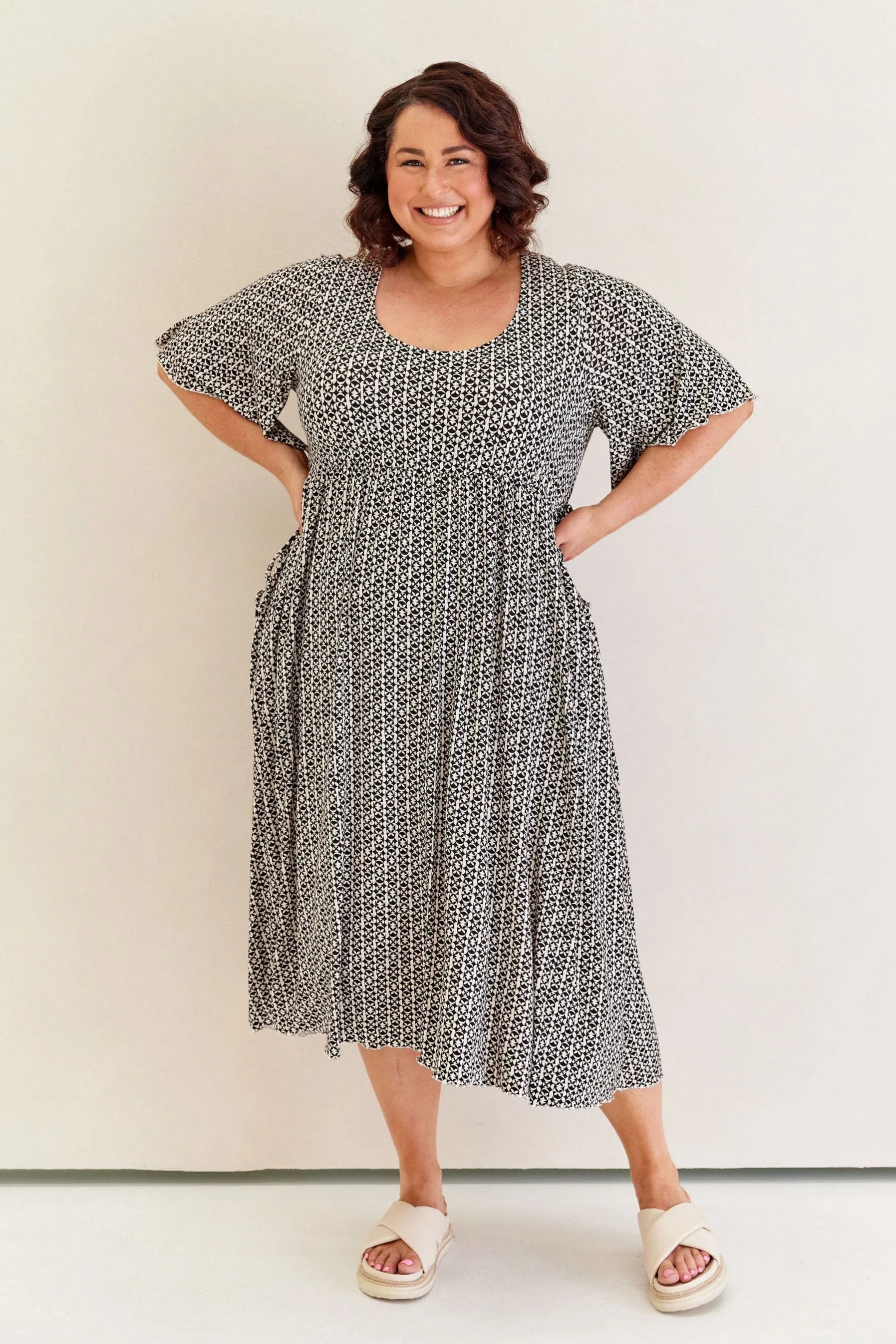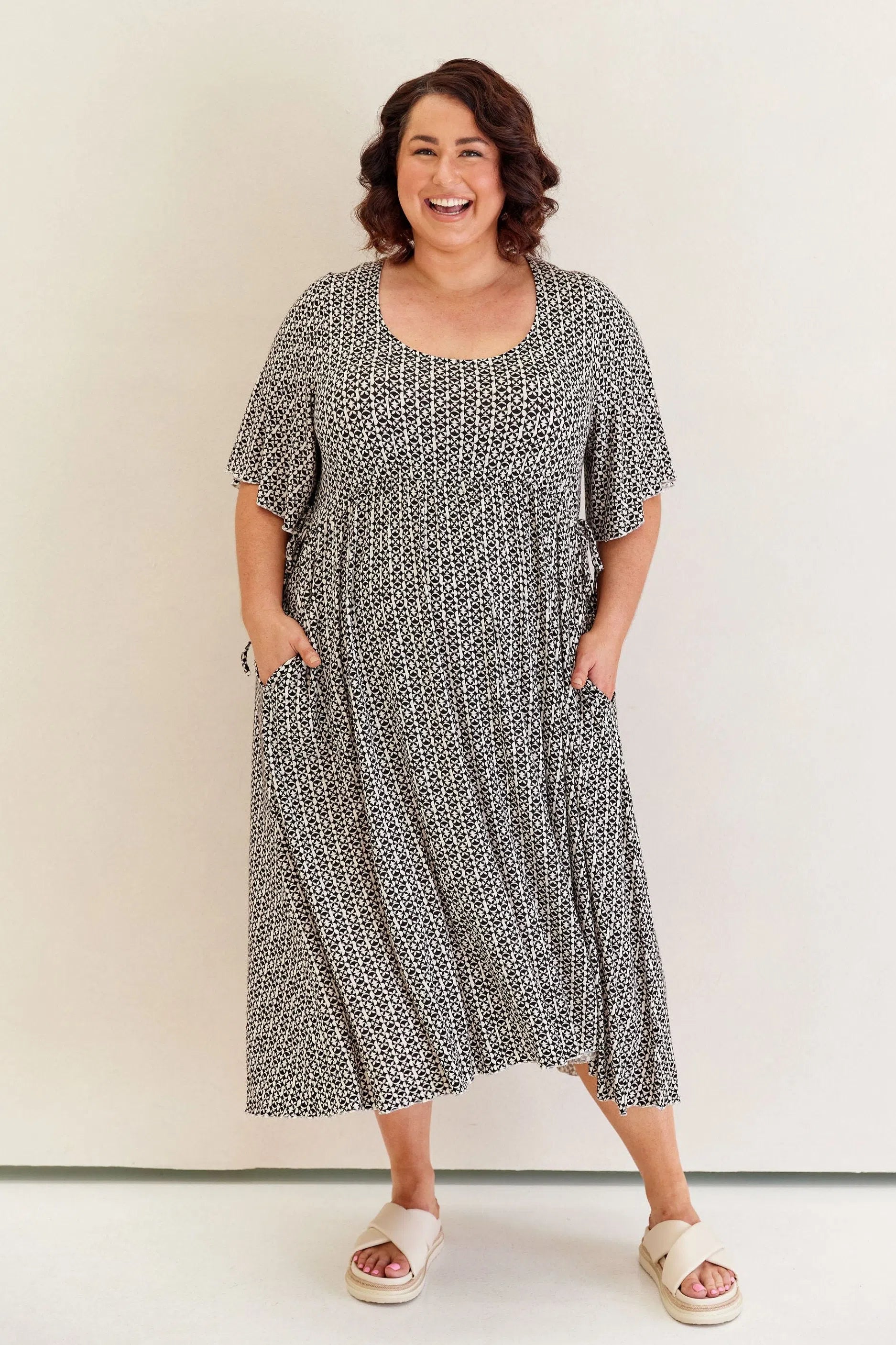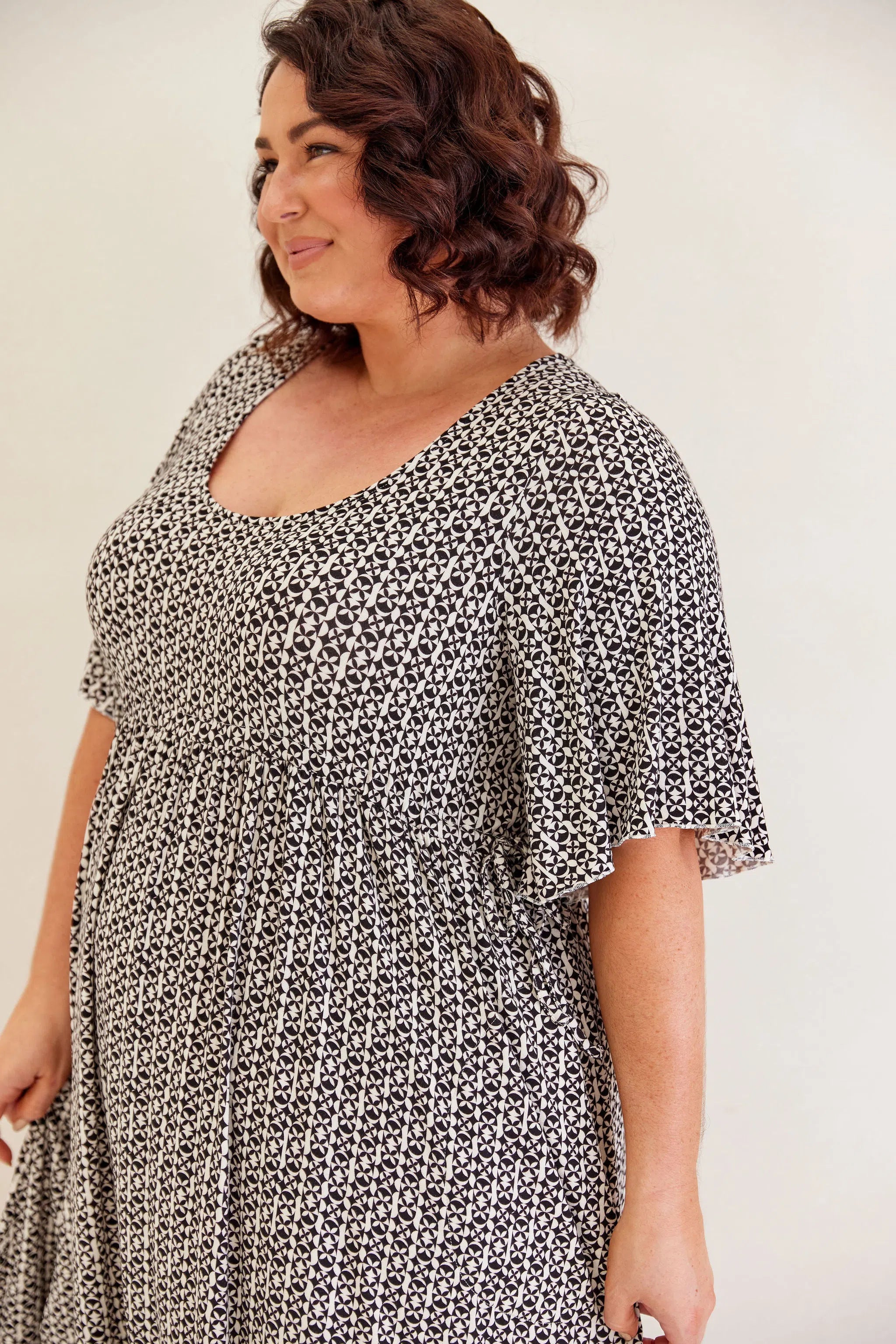 Feminine, floaty and comfy! This dress has so much swish and movement, with its generous skirt and babylock hem detail. Made from our famous super soft, stretchy jersey and with functional side ties at the waist, this piece is easy to wear and will shape to your body (our bodies all fluctuate, so our clothes should be made to accomodate!) This laid back style has feminine details that elevate the design so you can wear it casually or dress it up. Its got great upper arm and tum/bum coverage, while showing shape at the waist and showing just the right amount of cleavage (but you can still wear your normal bra). This design is sure to be a favourite among Peach loyals!