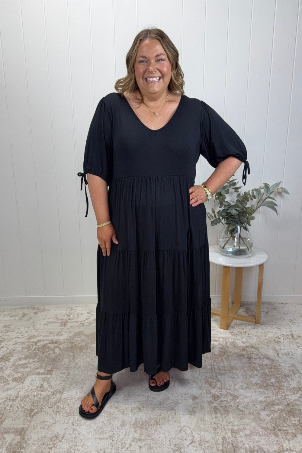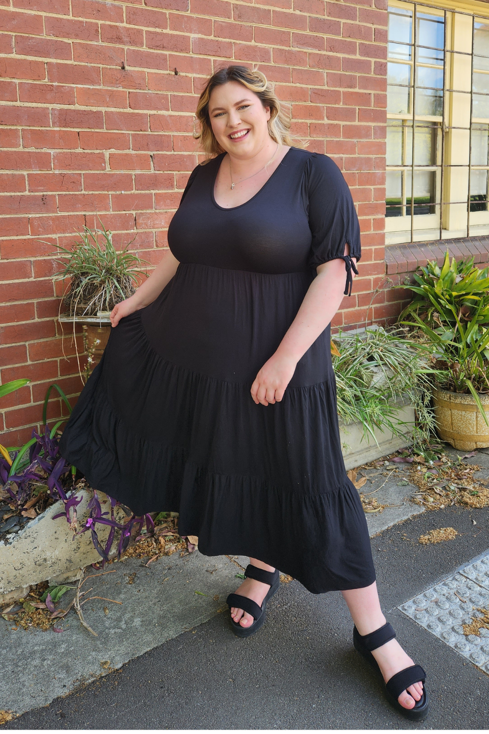 Model wearing stylish plus size black dress - Harlow Dress in Black by Peach The Label