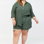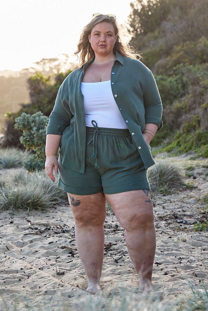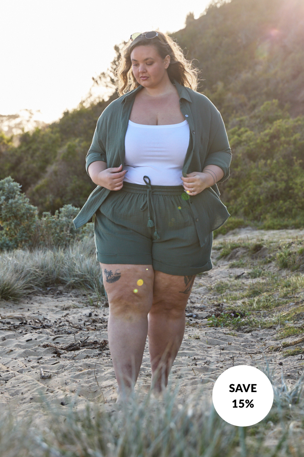 Annika wears a size 18/20 in the Reese Shirt and a 16/18 in the Romy Shorts.